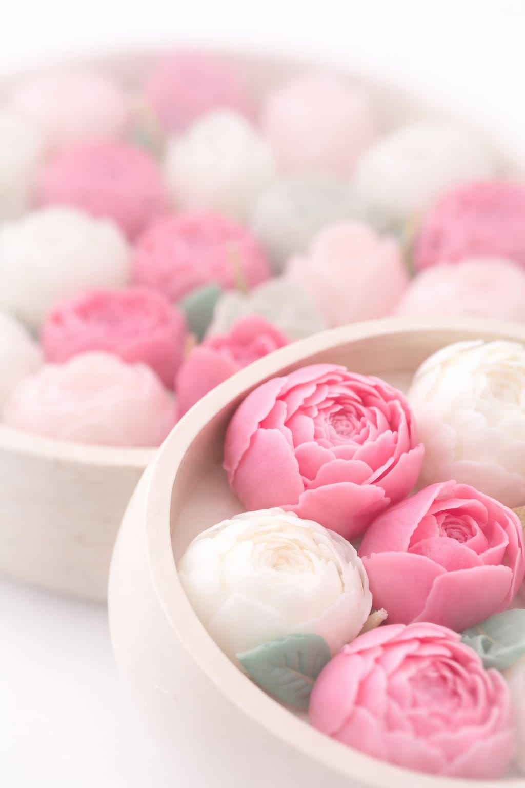 Na het gieten vullen we de kommen met kaarsvet en werken we ze af met prachtige pioenrozen en tulpen uit kaarsenwas.